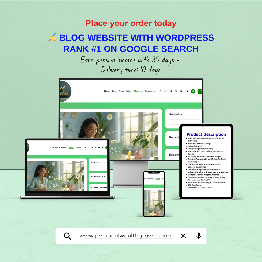 Launch your own powerful and SEO-optimized blog with WordPress. Perfect for beginners and pros alike, this site is designed to rank on Google, earn through AdSense, affiliate links, and connect you to a loyal audience. Includes user-friendly backend and monetization-ready structure. Perfect for lifestyle, personal finance, DIY, or niche blogging