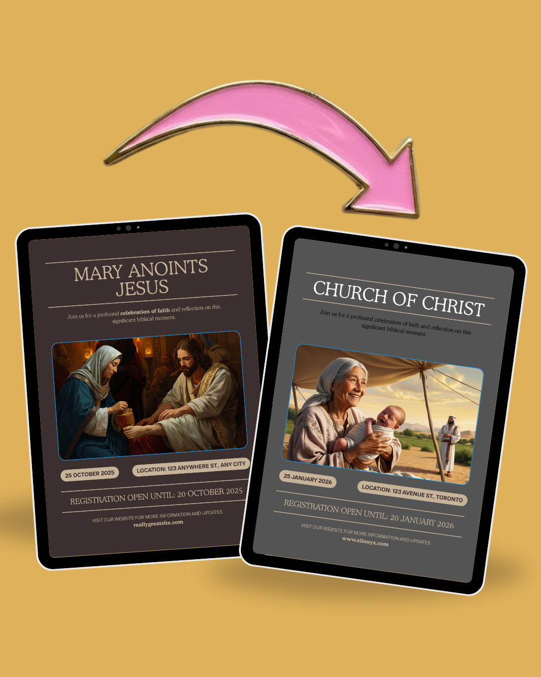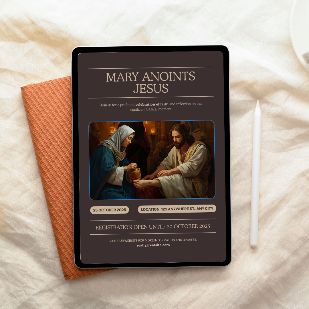 A beautifully designed Christian church flyer template inspired by the powerful biblical moment Mary Anoints Jesus. Fully editable in Canva, this elegant poster is perfect for church services, Bible teachings, worship nights, women’s ministry events, and special faith gatherings.