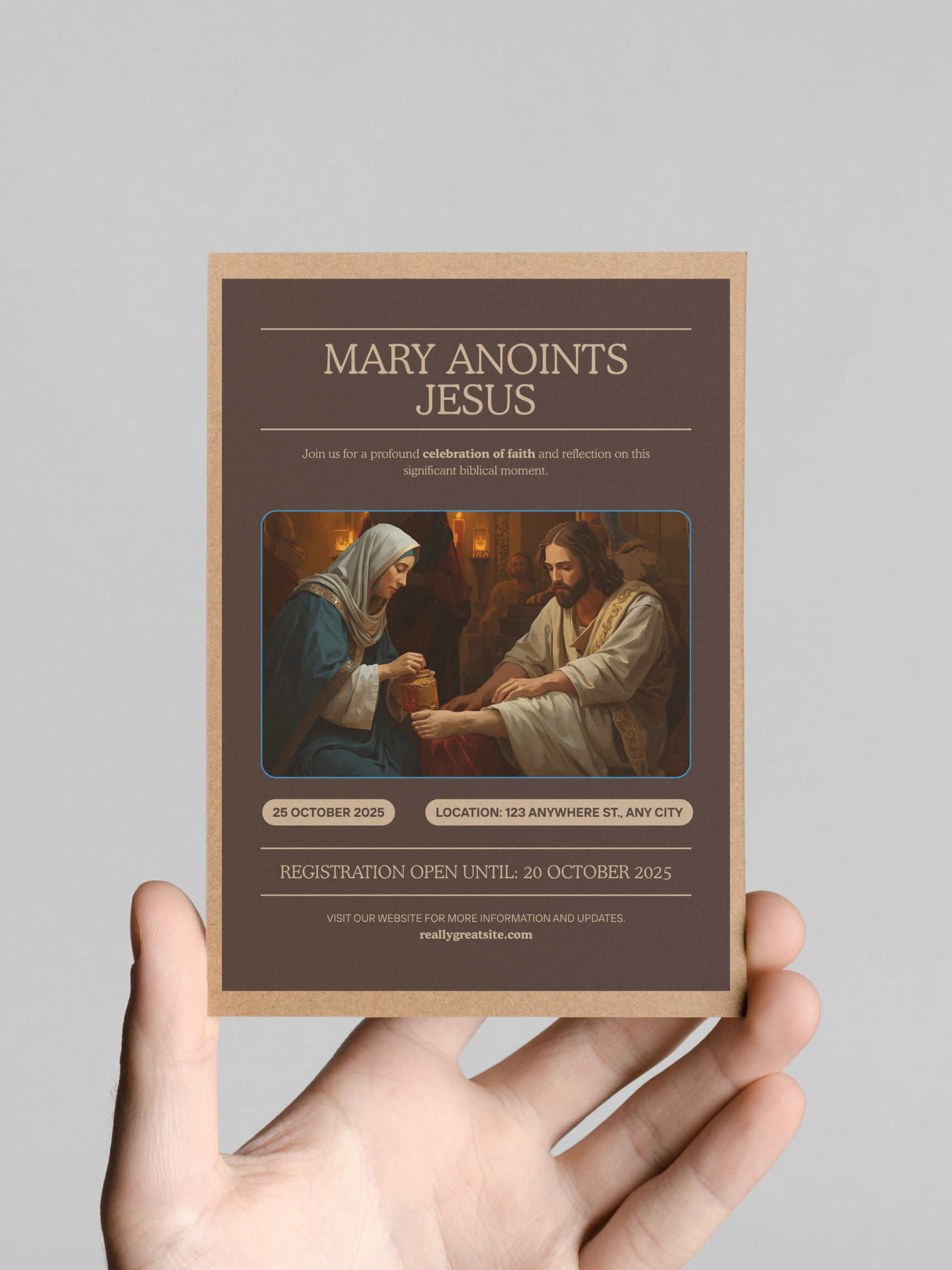 Mary Anoints Jesus Church Flyer Template | Editable Biblical Event Poster | Christian Canva Design for Church Services & Faith Events